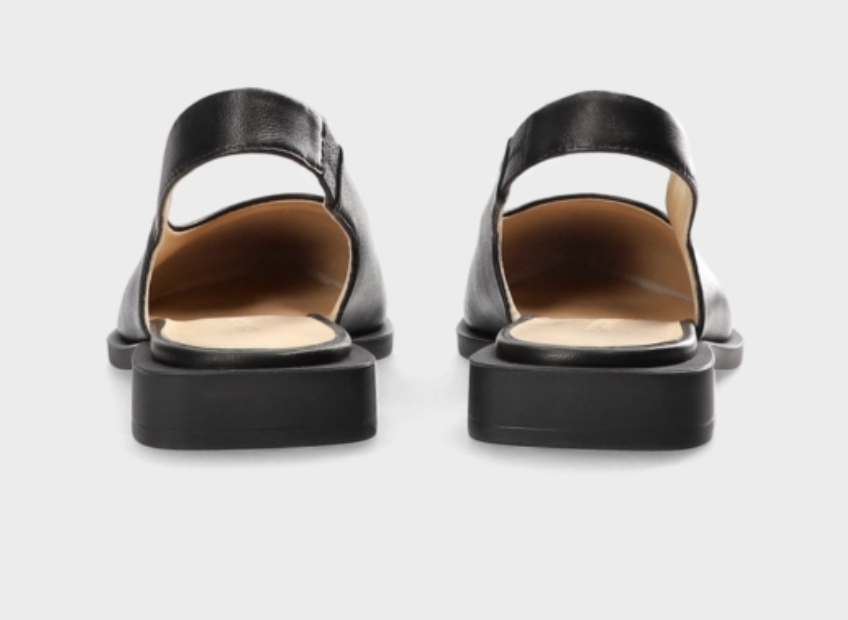- flache Sohle und Fersenriemen